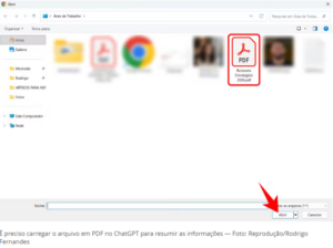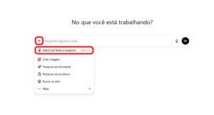 Eu acesso o ChatGPT, clico em “+” e seleciono “Adicionar fotos e arquivos”. Em seguida, eu escolho o PDF e envio.